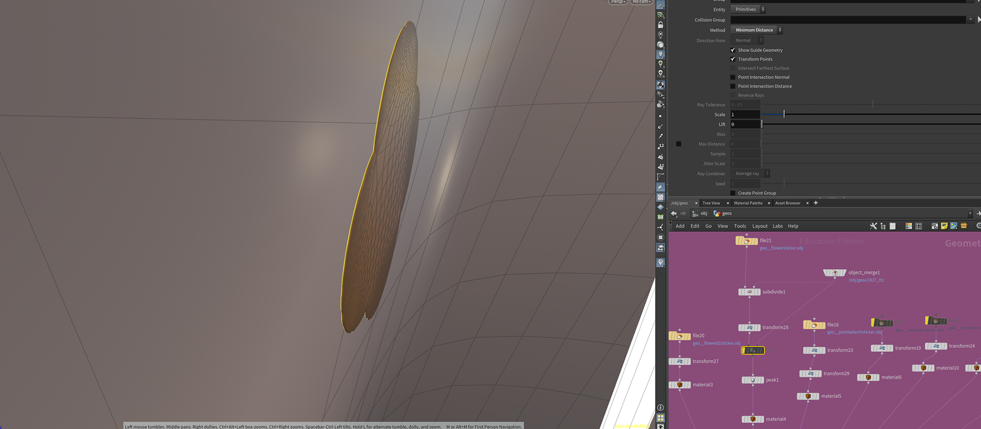 I was also concerned about the placement of the stickers since it took a lot of time to adjust their position manually. I wanted to find a more efficient way to do this. Fortunately, Zach came to my rescue and showed me how to use the ray node in Houdini and project a geometry on to another, which helped me speed up the process. Now that I have this concern cleared, I can shift my focus back to the priority for this week.